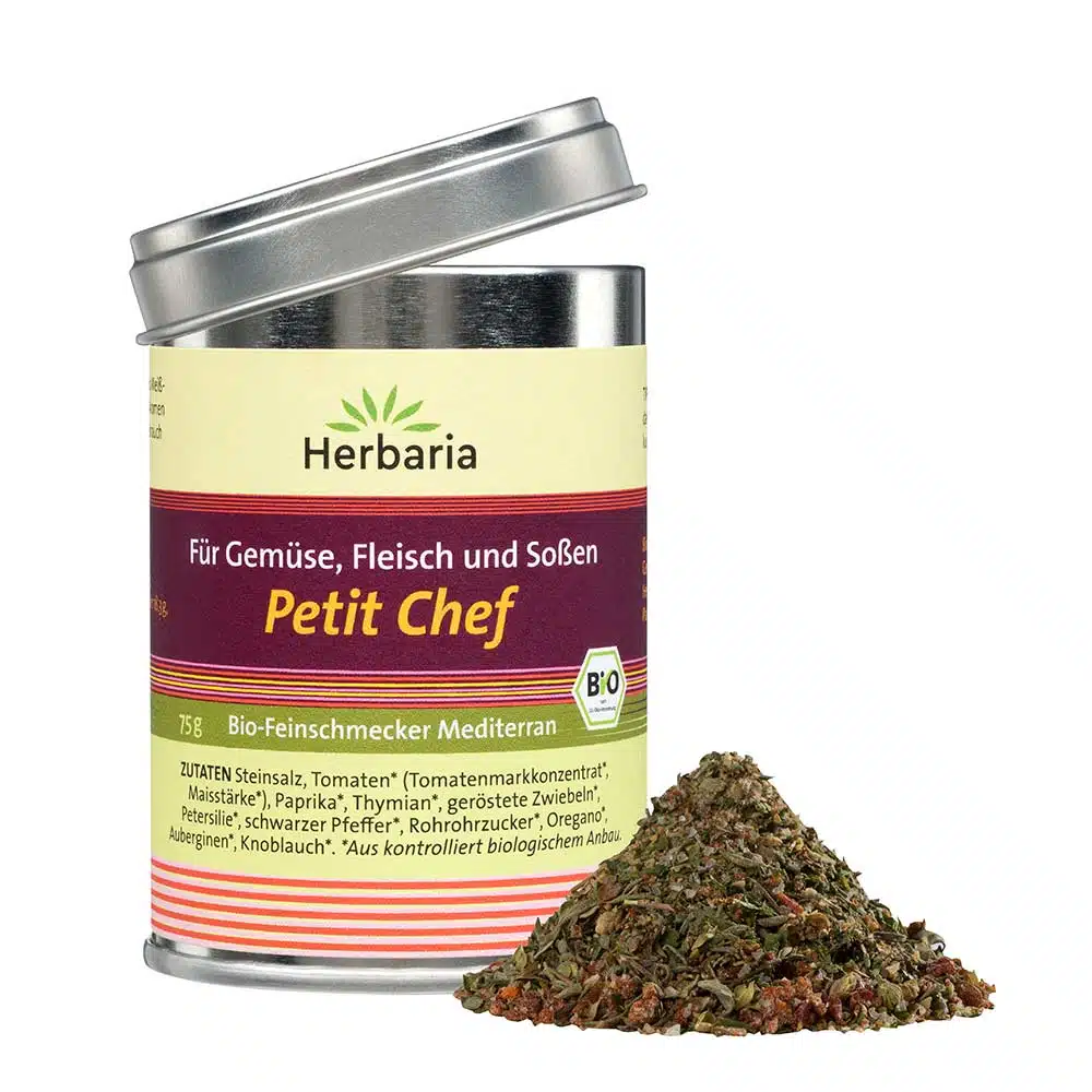 Herbaria Petit Chef ist eine Bio-Gewürzzubereitung für mediterrane Nudelsoßen, Eintöpfe, Gemüsesuppen und Ratatouille. Zutaten wie Tomaten, Thymian, Petersilie, Oregano und Knoblauch machen diese Gewürzmischung hervorragend für die mediterrane Küche. Als Dip mit Quark zubereitet, schmeckt Petit Chef auch wunderbar zu Ofenkartoffeln.