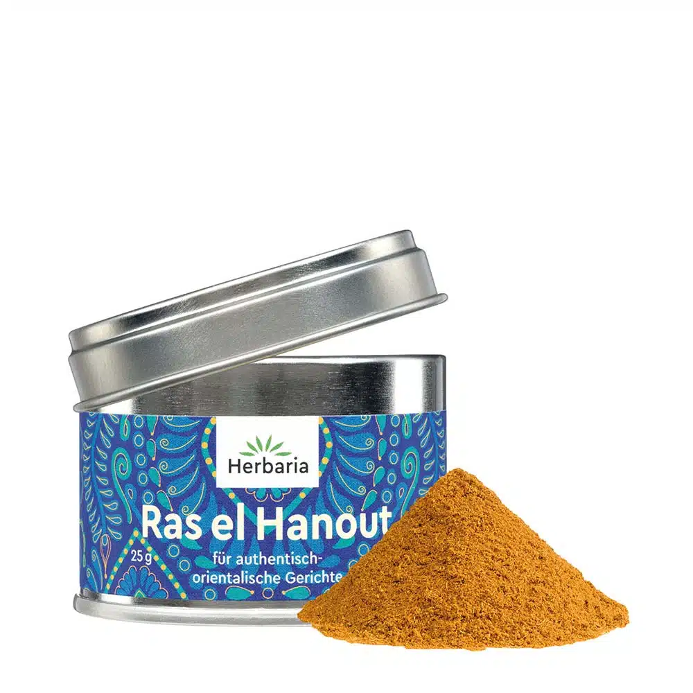 Herbaria Ras el Hanout in 100% Premium Bio-Qualität ist unsere Königin der orientalischen Bio-Gewürzmischungen. Ein Klassiker der Orient-Küche, den wir gemeinsam mit Spitzenkoch Hans Gerlach in einer gekonnt ausgewogenen Mischung neu interpretiert haben. Die 15 erlesenen Bio-Zutaten finden in Herbaria Ras el Hanout zu einem authentisch-orientalischen Genusserlebnis zueinander. Herbaria Ras el Hanout verzaubert mit seiner fein abgestimmten Gewürzvielfalt und holt die orientalische Genusswelt in die eigene Küche. Herbaria Ras el Hanout verleiht allen Gerichten ein rundes, süßlich-würziges Aroma aus Fenchel, Zimt, Piment, Kardomom und Kreuzkümmel mit dezenter Schärfe von Ingwer, Pfeffer und Chili. Herbaria Ras el Hanout eignet sich hervorragend für orientalisch zubereitetes Lamm oder Hühnchen und für Schmorgerichte. Verleiht auch Reis-, Linsen- oder Gemüsepfannen sowie Couscous oder Suppen authentisch-orientalisches Aroma. Ideal zum Verfeinern von Hummus oder für orientalische Dips.