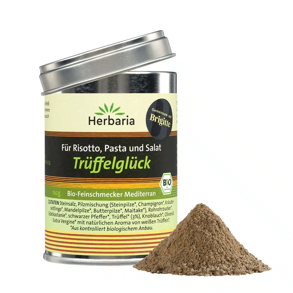 Herbaria Trüffelglück ist eine Bio-Gewürzmischung für edle Risotto-, Pasta-, Pilz- und Schmorgerichte oder feine mediterrane Salatdressings. Intensiv im Geschmack und Geruch nach Pilzen und Trüffel. Mit sechs verschiedenen Edelpilzen, Edelkastanie und Trüffel, bringt diese Gewürzmischung ganz spielerisch Geschmack in Risotto-, Pasta-, Pilz- und Schmorgerichte. Ein ideales Gewürz für den Herbst sowie Pilz- und Trüffel-Liebhaber.